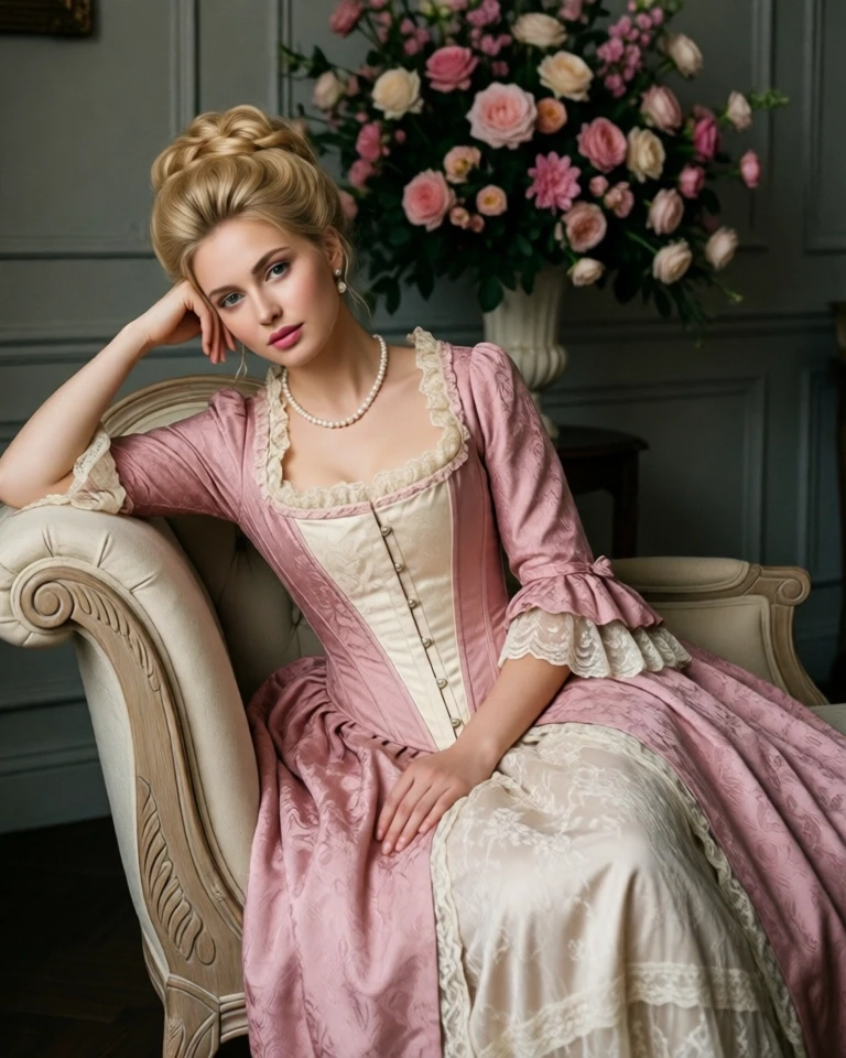 ![]() Prompt: a beautiful blonde with her long hair worn up in a wide Edwardian updo hairstyle. she is wearing a Victorian bustier in soft pink jacquard with a center front panel in cream and soft cream lace ruffle trim around the inside neckline. there are pearl buttons down the front. with a full pink jacquard skirt and lace petticoats. she has a plain pearl necklace and earrings and soft pink lipstick. she is sitting on a cream chaise lounge with carved light wood trim, leaning against one side of the chaise lounge, resting her head on her hand. the room has light walls but dark, intimate lighting. behind her, one enormous flower arrangement with pink and cream flowers rests on a high table against the wall. |