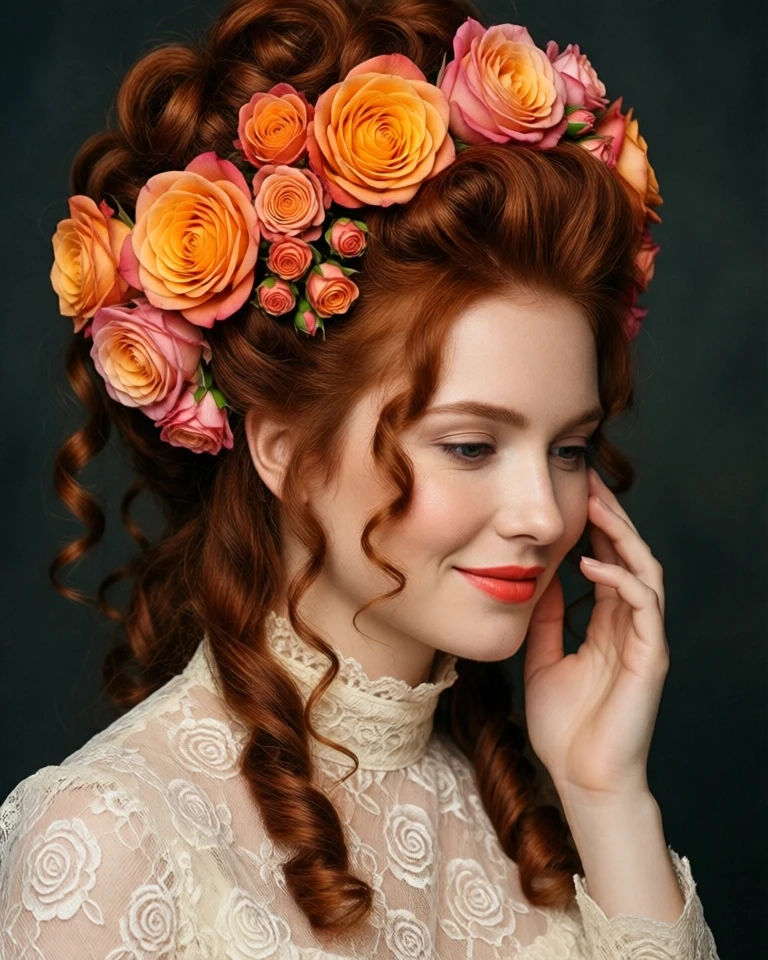 ![]() Prompt: a beautiful redhead with her long hair worn up in an elaborate rococo hairstyle. several loose curls dangle from the updo. in her hair, a many roses have been arranged in various shades of orange and pink, with tiny rose clusters added in for contrast, and curls of hair peeking out from the flowers. she is wearing a blouse in cream lace with a rose pattern and a high collar. she has a slight smile, with coral lipstick, with the back of her hand raised gently to her face, and her eyes slightly downcast. close portrait |