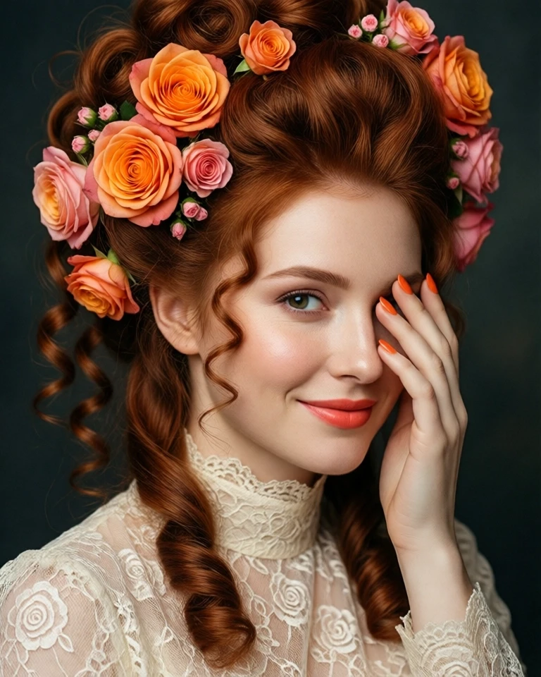 ![]() Prompt: a beautiful redhead with her long hair worn up in an elaborate wide rococo hairstyle. several small loose curls dangle from the updo. in her hair, a many roses have been arranged in various shades of orange and pink, with tiny rose clusters added in for contrast, and curls of hair peeking out from the flowers. she is wearing a blouse in cream lace with a rose pattern and a high collar. she has a faint hint of a smile, with orange-pink lipstick. her hand is raised gently to her face, with nails that match the lipstick. She is looking at the viewer from the side of her eye, shyly. close portrait |