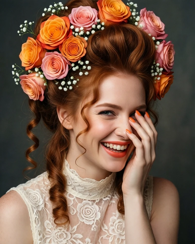 ![]() Prompt: a beautiful redhead with her long hair worn up in an elaborate wide rococo hairstyle. several loose curls dangle from the updo. in her hair, many roses have been arranged in various shades of orange and pink, with small rose clusters and baby's breath for contrast. curls of hair peek out from the flowers. she is wearing a sleeveless blouse in cream lace with a rose pattern and a high collar. she is laughing, trying to hide her laughter. she is wearing orange-pink lipstick and nail polish to match. her hand is touching her face. She is looking at the viewer from the side of her eye, shyly trying to avert her gaze. close portrait |