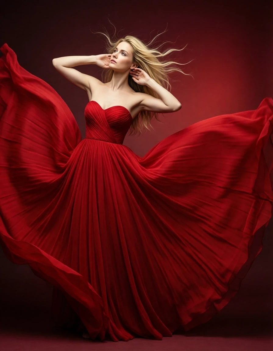 ![]() Prompt: a blonde woman with a contemplative expression, wearing red organza dress with a strapless sweetheart neckline and a very long full skirt. the skirt is blowing around and behind her like an enormous sheet billowing in the wind. it is impossible to see the hem of the skirt because it is so large. she is leaning back and to the side, looking upward, raising her arms, with her hands to the sides of her face. her hair blows faintly in the wind. behind her, a dark red background gradiant. a dramatic surreal fashion photo |