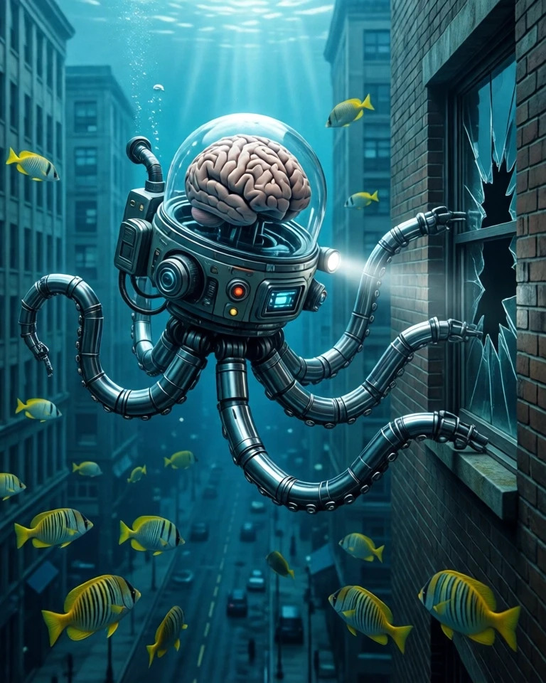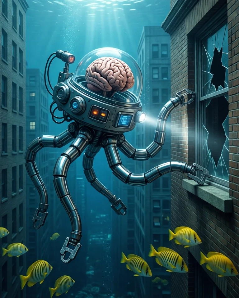 ![]() Prompt: a brain-controlled undersea robot. the brain is in a clear dome attached to robotic controls, visual sensors, a small flashlight, and a set of 6 tentacle-like appendages made of sleek telescopic metal with clamps on the end. the brain-robot is on a dystopian submerged downtown street. Skyscrapers are fully submerged below the sea. a school of yellow fish swim around the corner of a building. the brain-robot is trying to pull at a broken window with the clamps on the ends of its appendages |