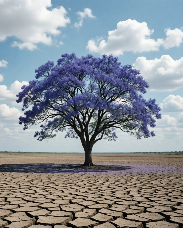![]() Prompt: a lone Blue Jacaranda tree growing in an expanse of cracked earth in a surreal landscape. the sky is pale blue with numerous puffy white clouds spaced out into the distance. cinematic composition with dramatic contrast |