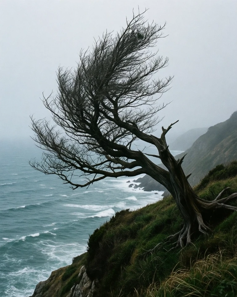 ![]() Prompt: a lone tree leafless tree on the side of a seaside cliff. the tree has been blown by the ocean wind over the years, and the limbs bend away from the ocean and in towards the land. viewed from the edge of the cliff, on a foggy morning. cinematic composition |