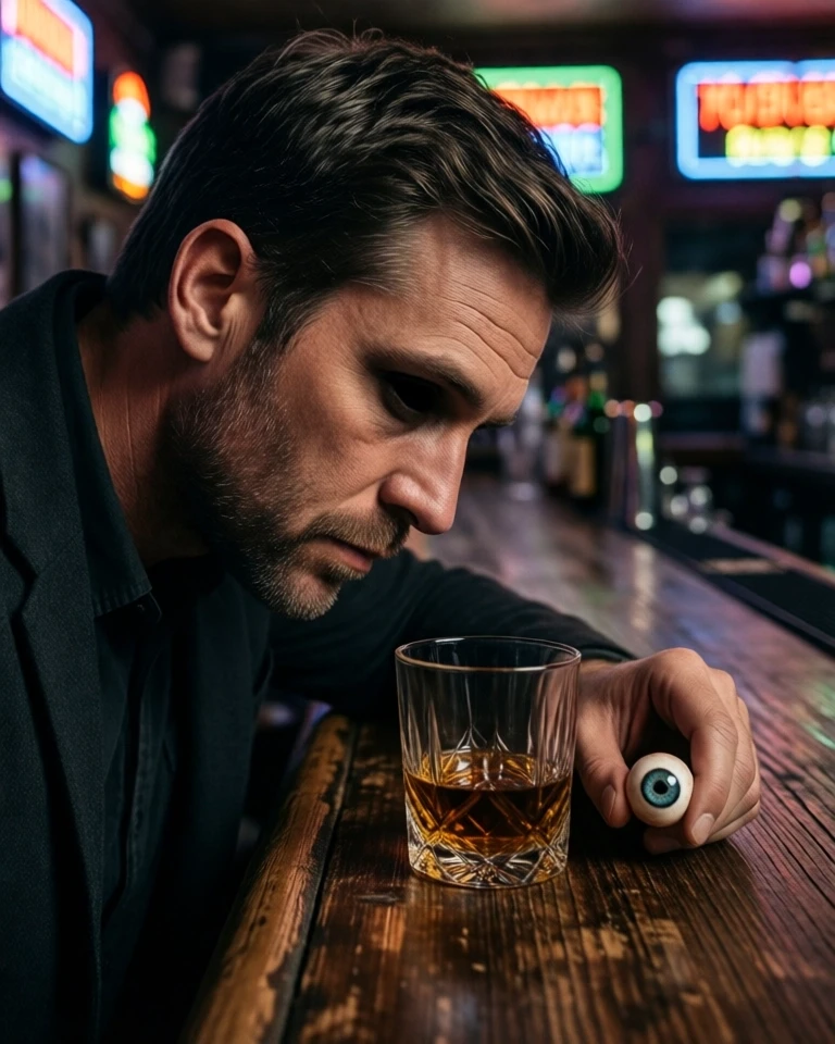![]() Prompt: a man sitting at a rustic bar with colorful neon signs, with a bourbon in a rocks glass, viewed from the side. his head is facing down, looking toward the glass. his eye sockets are dark and empty because his eyes are missing. he has a hand resting near the glass. he is holding an eye in that hand. the eye is looking at the viewer. close portrait, chiaroscuro, ominous. cinematic fine art photograph |