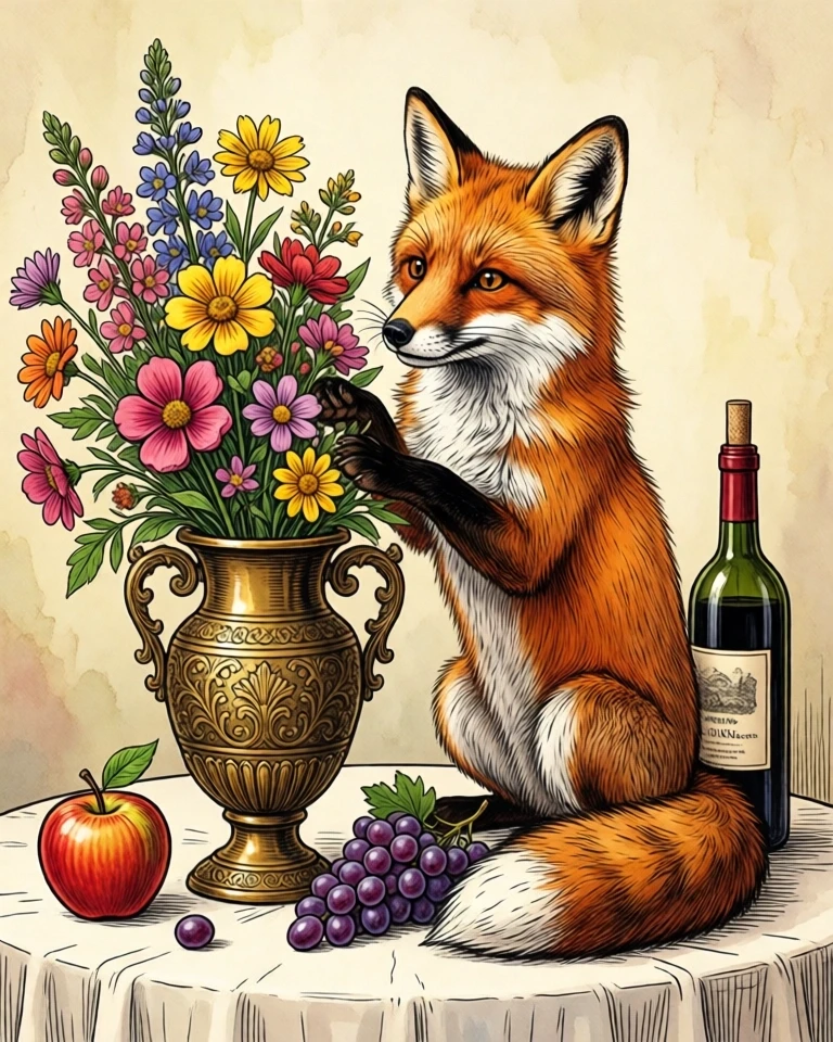 ![]() Prompt: a red fox standing on a table, arranging flowers in a carved antique brass vase. there is an apple, some grapes, and a bottle of wine beside the flowers. Hand-drawn pen and watercolor illustration in a cheerful style of Ludwig Bemelmans |