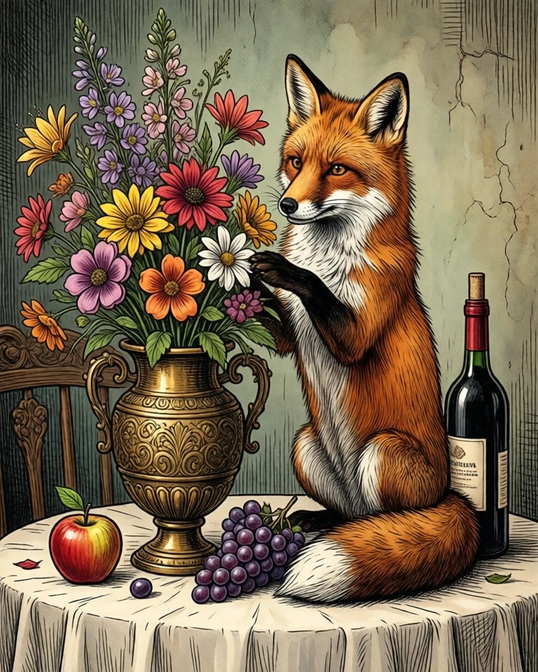 ![]() Prompt: a red fox standing on a table, arranging flowers in a carved antique brass vase. there is an apple, some grapes, and a bottle of wine beside the flowers. Hand-drawn pen and watercolor illustration in the style of Edward Gorey Negative Prompt: - |