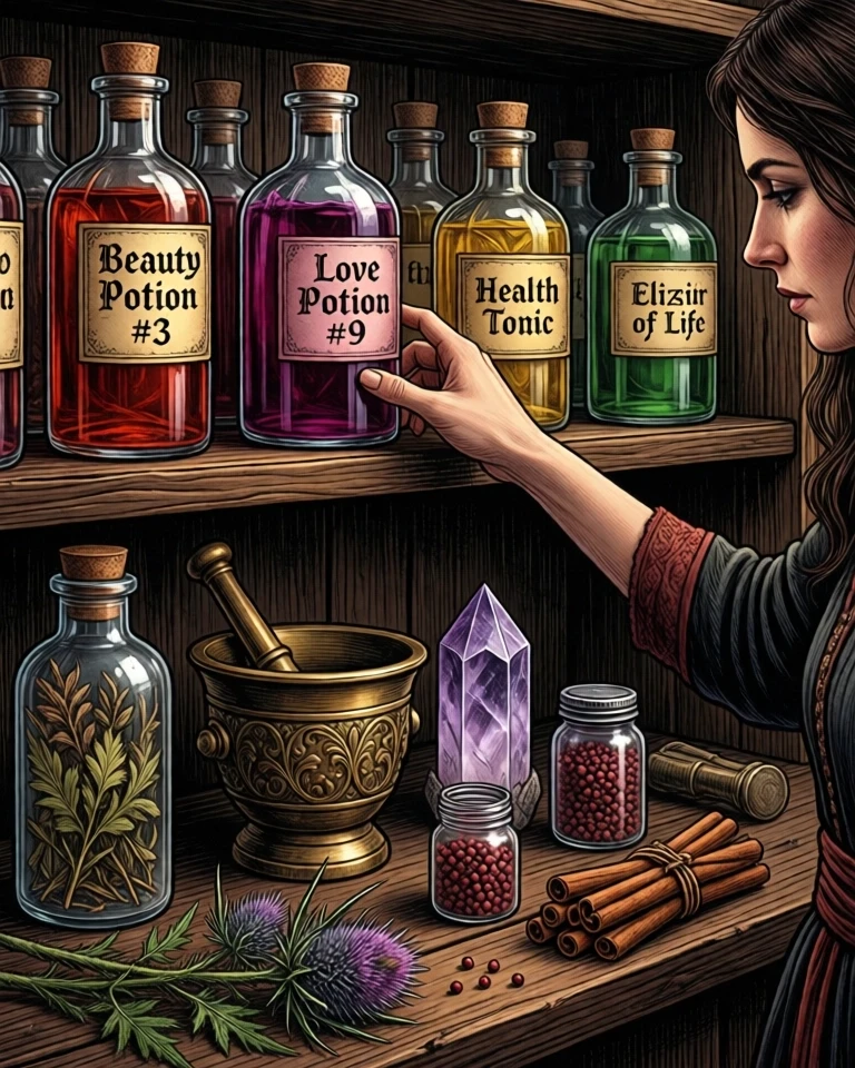 ![]() Prompt: a shopper buying potions from a witch's magic shop. there are bottles on the shelf with liquids labeled "Beauty Potion #3", "Love Potion #9", "Health Tonic", and "Elixir of Life". a woman's hand is reaching for the second bottle. the next shelf has an unlabeled bottle of dried herbs, a carved brass mortar and pestle, a quartz crystal, a small jar of pink peppercorns, a dried thistle bloom, and a bundle of cinnamon sticks. detailed ink illustration with rich colors and intense darks |