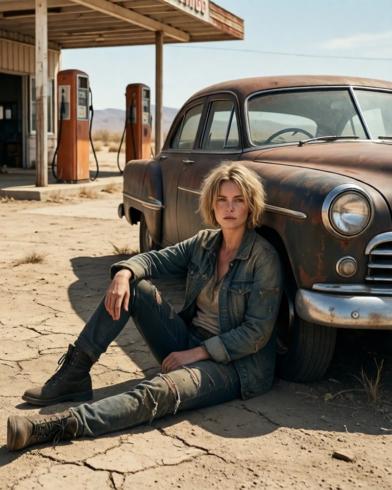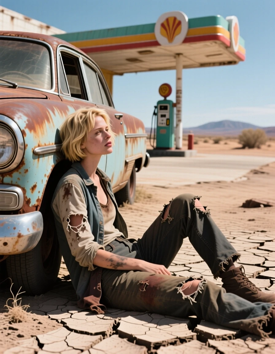 ![]() Prompt: a woman with short dirty blonde hair and dirty torn clothes sitting on the dry, cracked ground. she's leaning her back against an old rusty junker car parked next to an abandoned 1950s retro gas station in a desert wasteland,. cinematic composition |