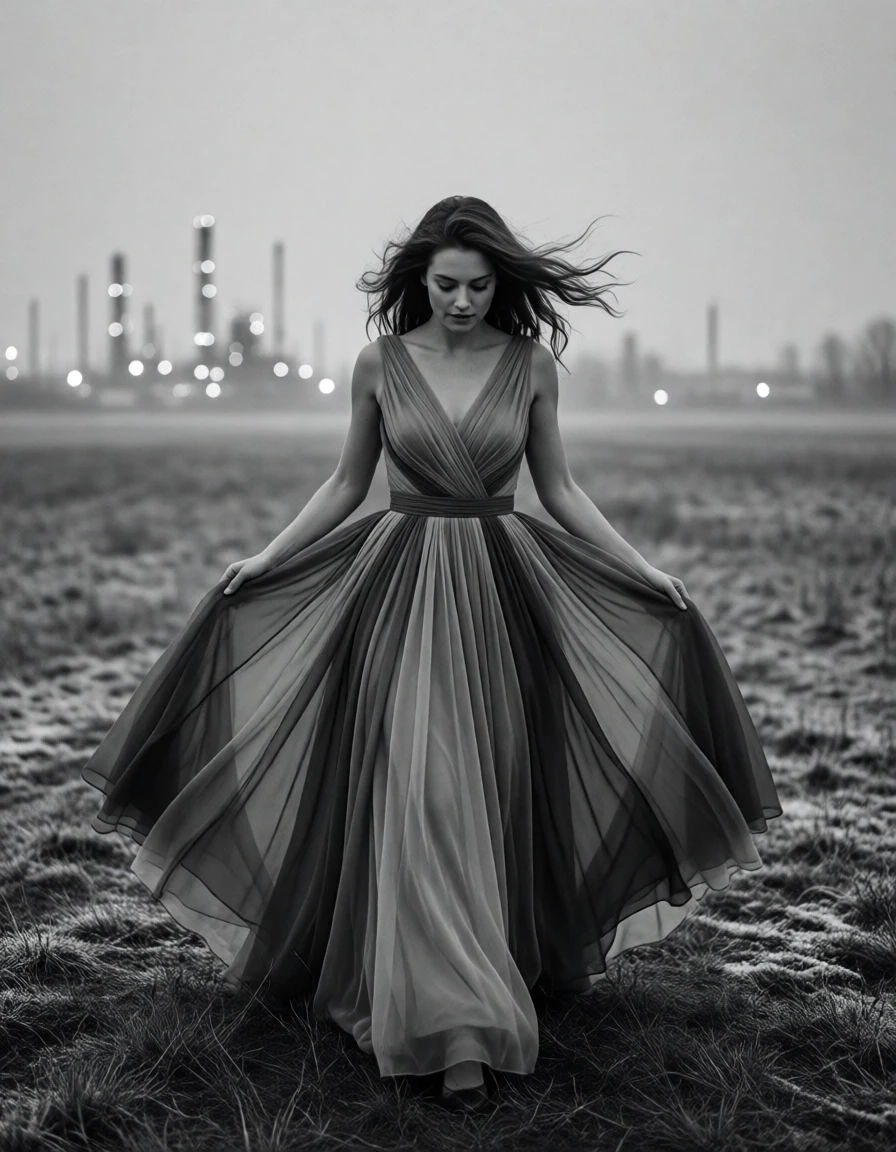 ![]() Prompt: an empty flat field in winter. in the distance, a refinery can be seen, lights glowing softly in the morning fog. a beautiful woman in a long gown is walking towards the viewer, looking downward. her gown is sleeveless, with a very full circle skirt made of chiffon with several chiffon and organza petticoats. her hair and skirt are blowing in the wind. she is lifting her skirt with both hands. black and white photography, low contrast gray tones. |