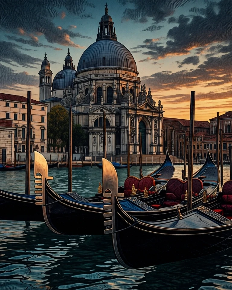 ![]() Prompt: Basilica di Santa Maria della Salute as seen from the gondola dock at San Marco (Vallaresso). gondolas in the foreground. detailed ink illustration with rich colors and intense darks |