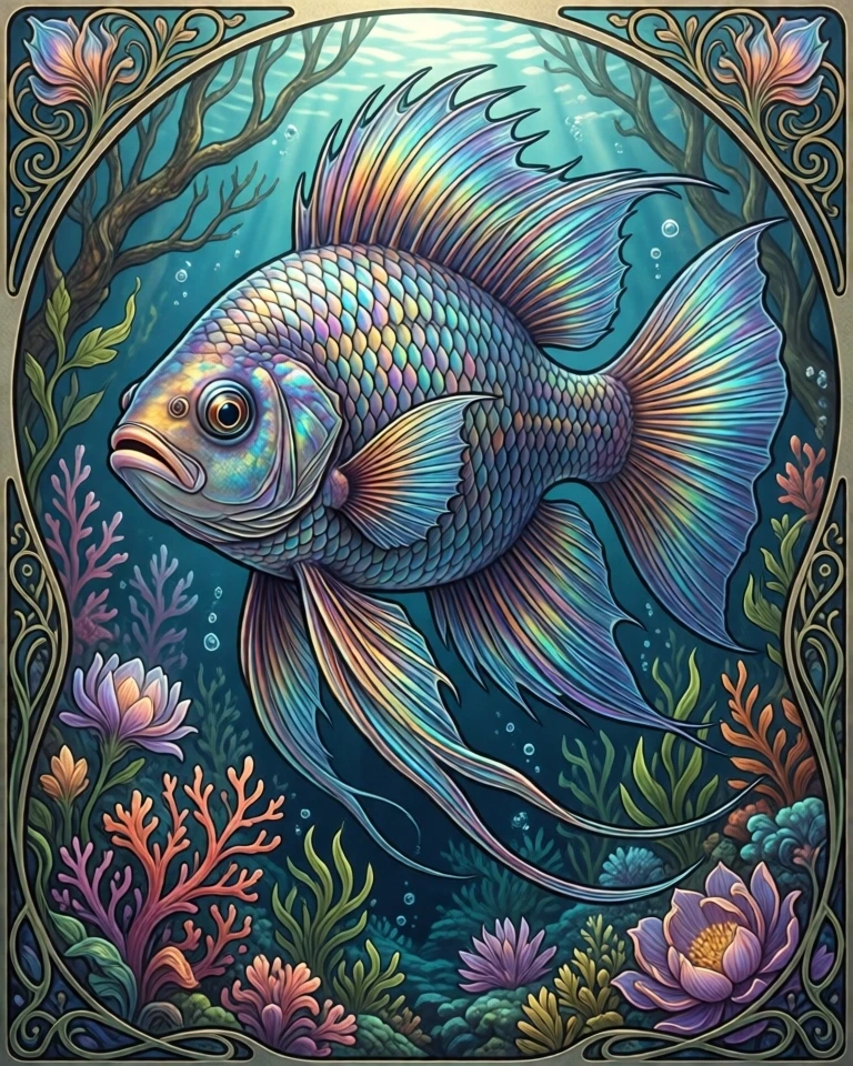 ![]() Prompt: beautiful fish with opalescent scales in a fantasy underwater garden. graphic illustration with curvilinear forms in Art Nouveau style, Alphonse Mucha |