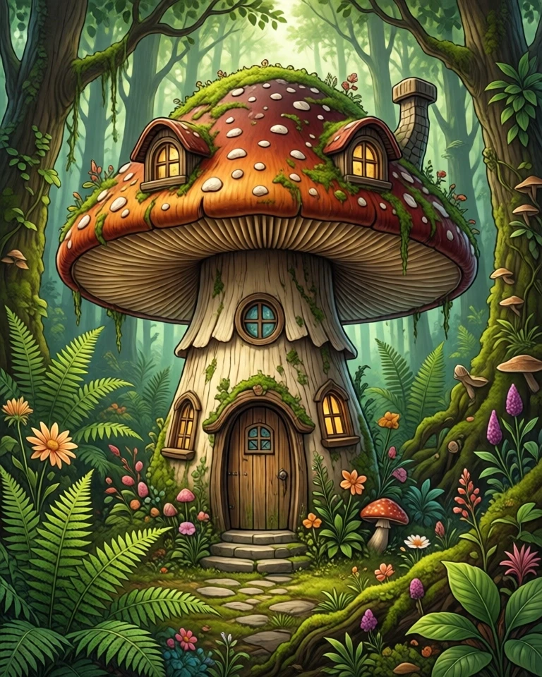 ![]() Prompt: beautiful mushroom house with windows in the cap and a door in the stem, in a forest with ferns and leafy plants, flowers and moss, fine art illustration in a whimsical style painted by alphonse mucha, |