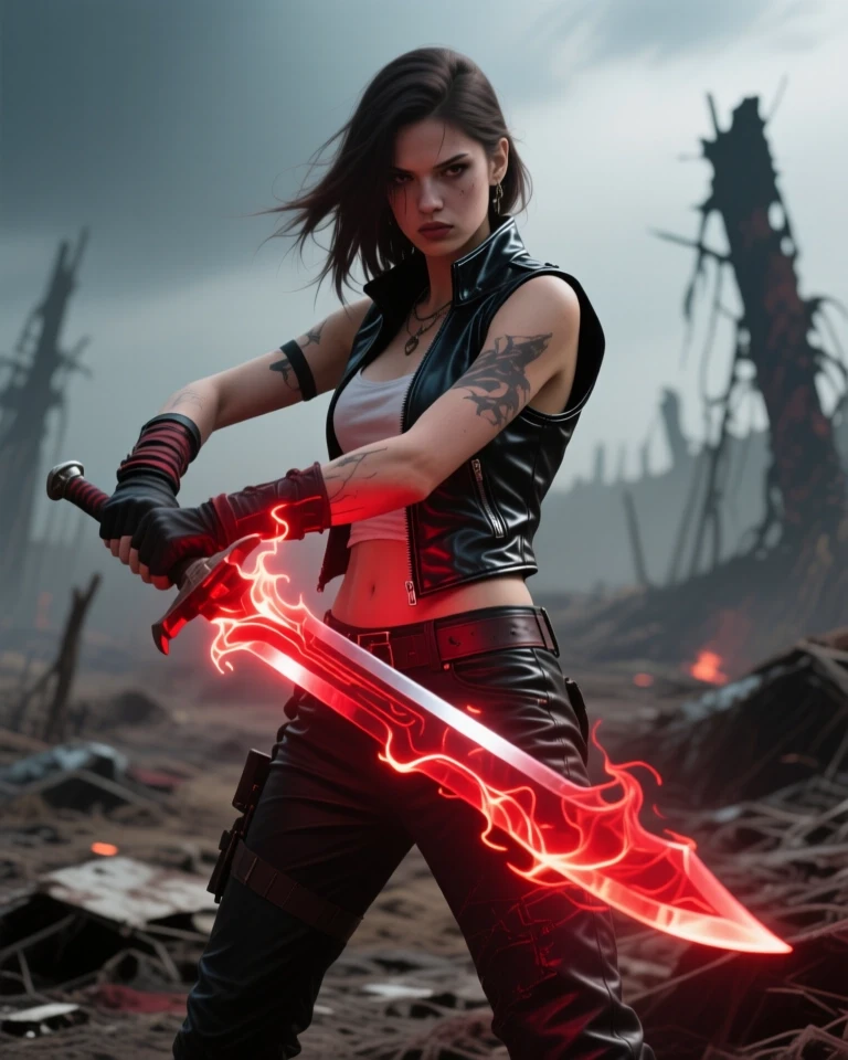 ![]() Prompt: beautiful woman wielding a glowing fiery reddish sword in a post apocalyptic wasteland. she is wearing a leather vest and pants, with renegade fashions. |
