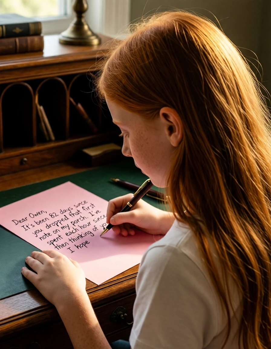 ![]() Prompt: close photographic portrait of a cute redhead girl with freckles, viewed from over her shoulder. the girl is sitting at a classical writing desk, writing a love letter with a pen on pink paper. the love note reads "Dear Owen, It's been 82 days since you dropped that first note on my porch. I've spent each hour since then thinking of you. I hope" in a handwritten style. cinematic photography with touches of warm sunlight. |