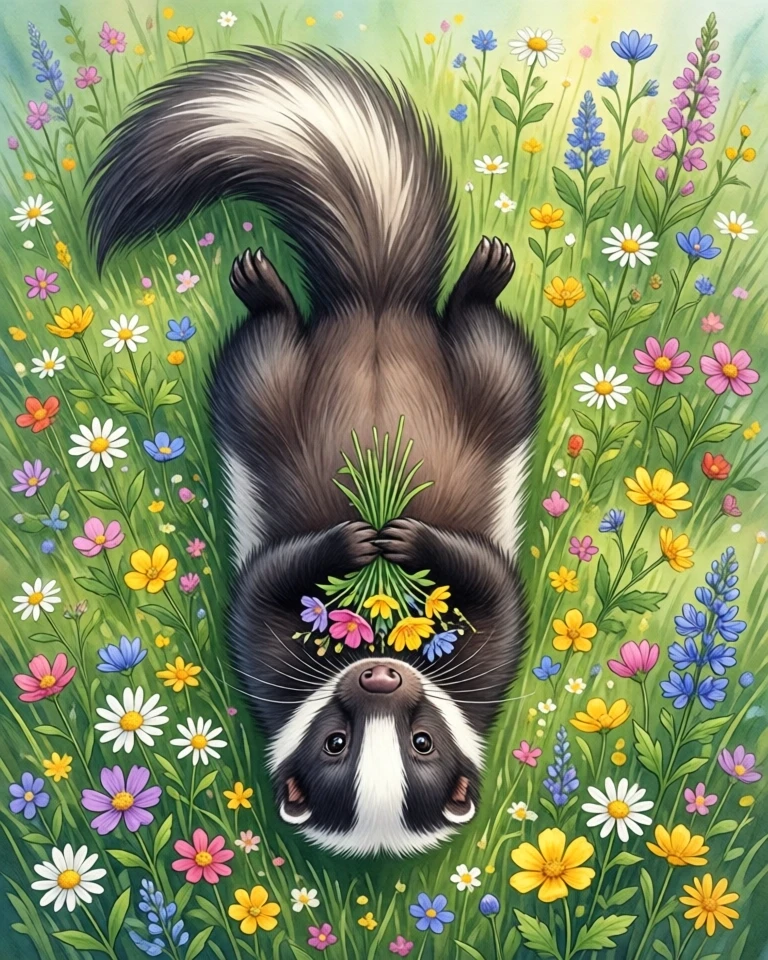 ![]() Prompt: cute skunk, laying on her back, upside down, in a wildflower meadow, holding a bunch of flowers to her nose. top down perspective. watercolor painting with translucent colors |