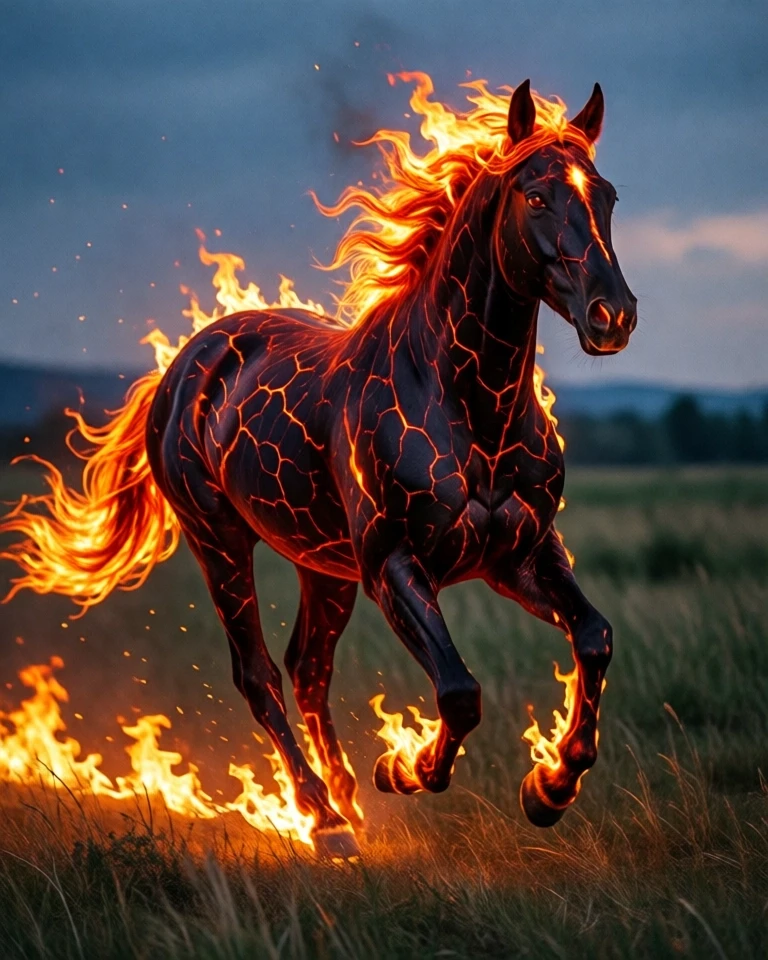 ![]() Prompt: glowing fire horse running through an open field at dusk. the horse is a Chinese fire horse, a creature of spirit and myth. the horse is black with licks and cracks of red and orange flame with white hot tips. the flames complement his form and enrich his beauty as they envelop his entire shape. his tail is long and full of flames at the end. every part of the horse is made of fire and glowing embers. a trail of fire stretches out behind the horse. |