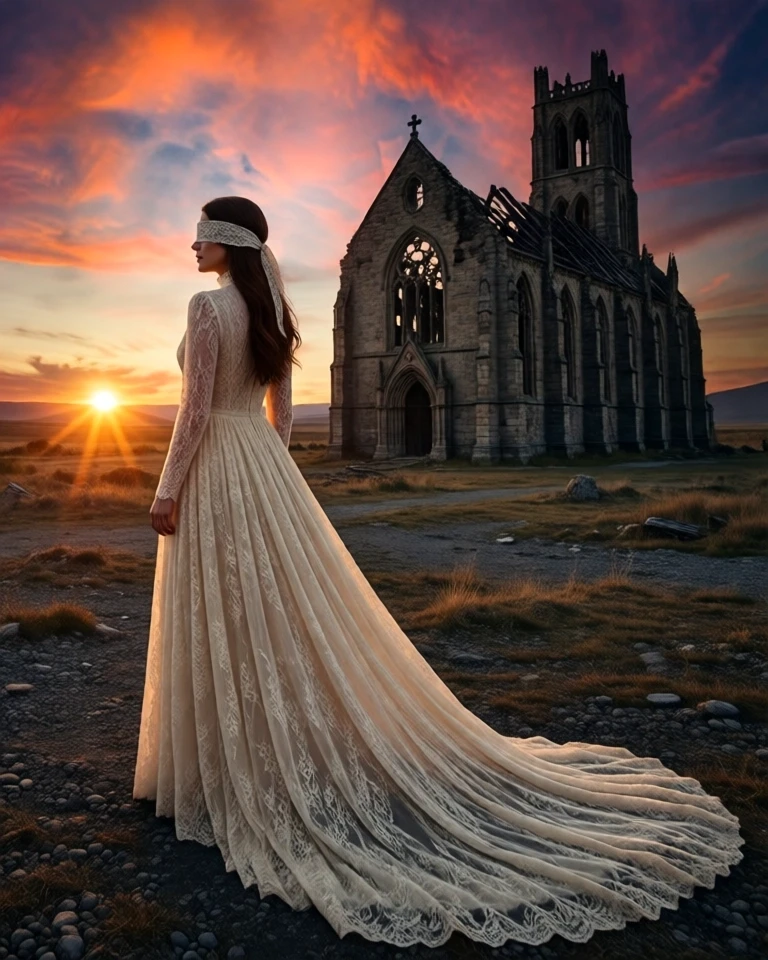![]() Prompt: surreal artwork of a woman with dark brown hair, viewed from the side. she is wearing a cream lace mock turtleneck dress with an incredibly long train and a matching lace blindfold. she is walking towards a ruined Gothic church in an empty wasteland, the church has been burned and the roof has collapsed. the sun is setting the sky ablaze in the background. wide angle. cinematic composition |