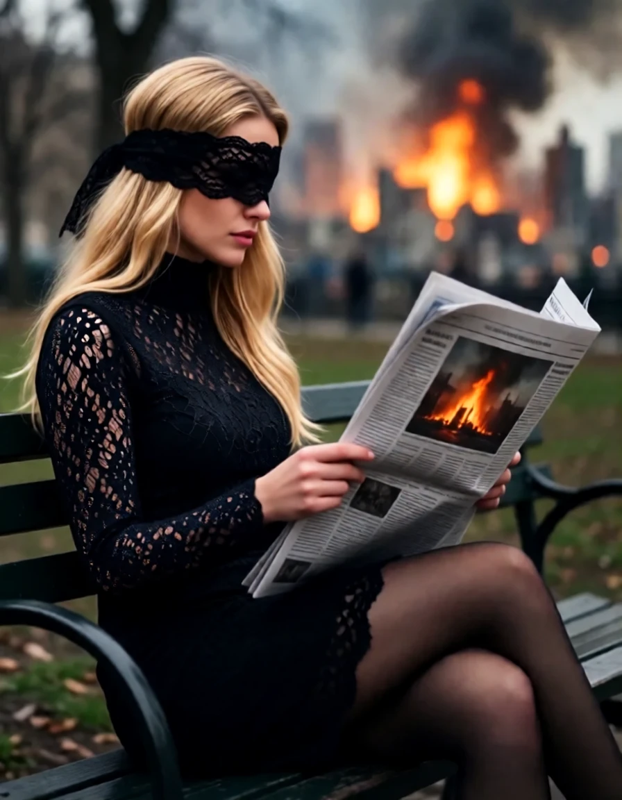 ![]() Prompt: blonde woman seen from the side, sitting on a park bench. she is wearing a black lace mock turtleneck dress and matching lace blindfold. she is looking at a newspaper with her legs crossed, looking relaxed. the part of the newspaper visible to the viewer shows a city on fire. behind her, out of focus, is a city on fire. moody, bleak, dramatic composition |