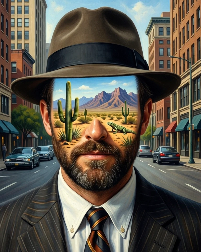 ![]() Prompt: very close portrait of a man wearing a suit jacket, necktie and fedora, with a downtown street behind him. where his head and neck should be, there is a surreal desert scene with a cactus, a lizard, and a mountain range. this desert scene is only visible where his head should be. oil painting |
