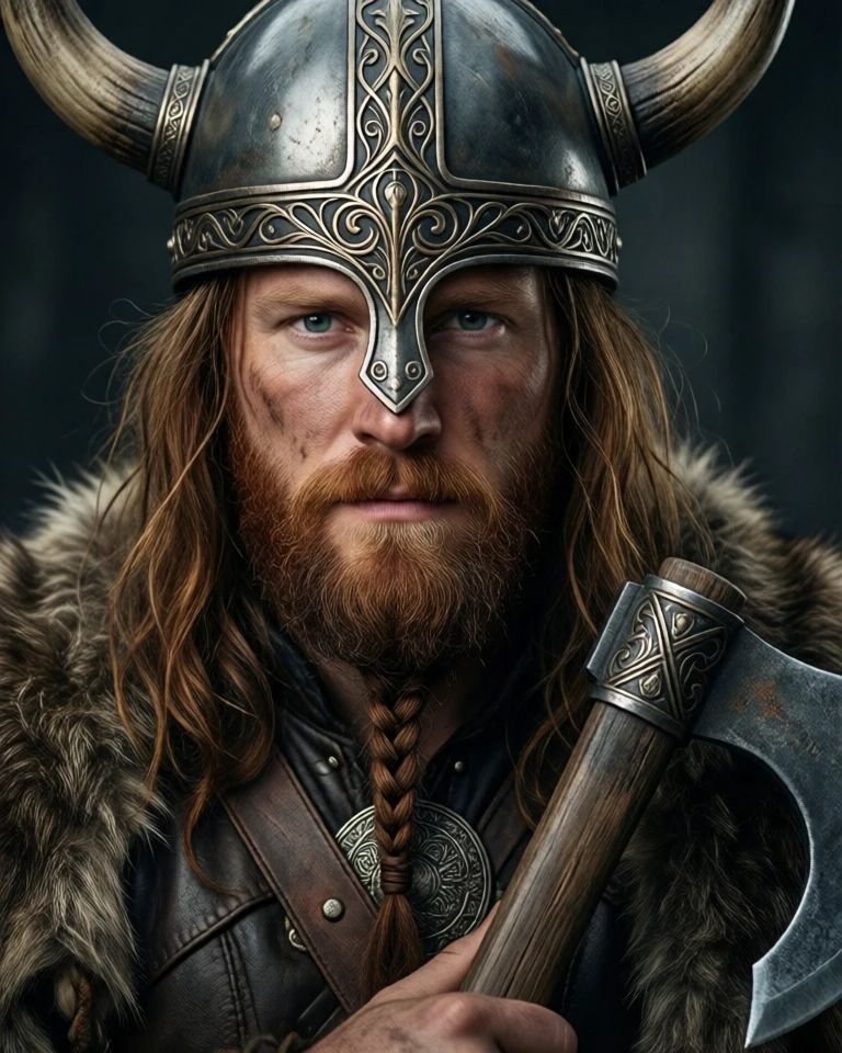 ![]() Prompt: viking warrior wearing a helmet with horns, art Nouveau inspired metalwork trim. he has long dirty auburn hair and a braided beard. looking at viewer. one hand holding a large axe. wearing leather and furs. close portrait. cinematic composition |