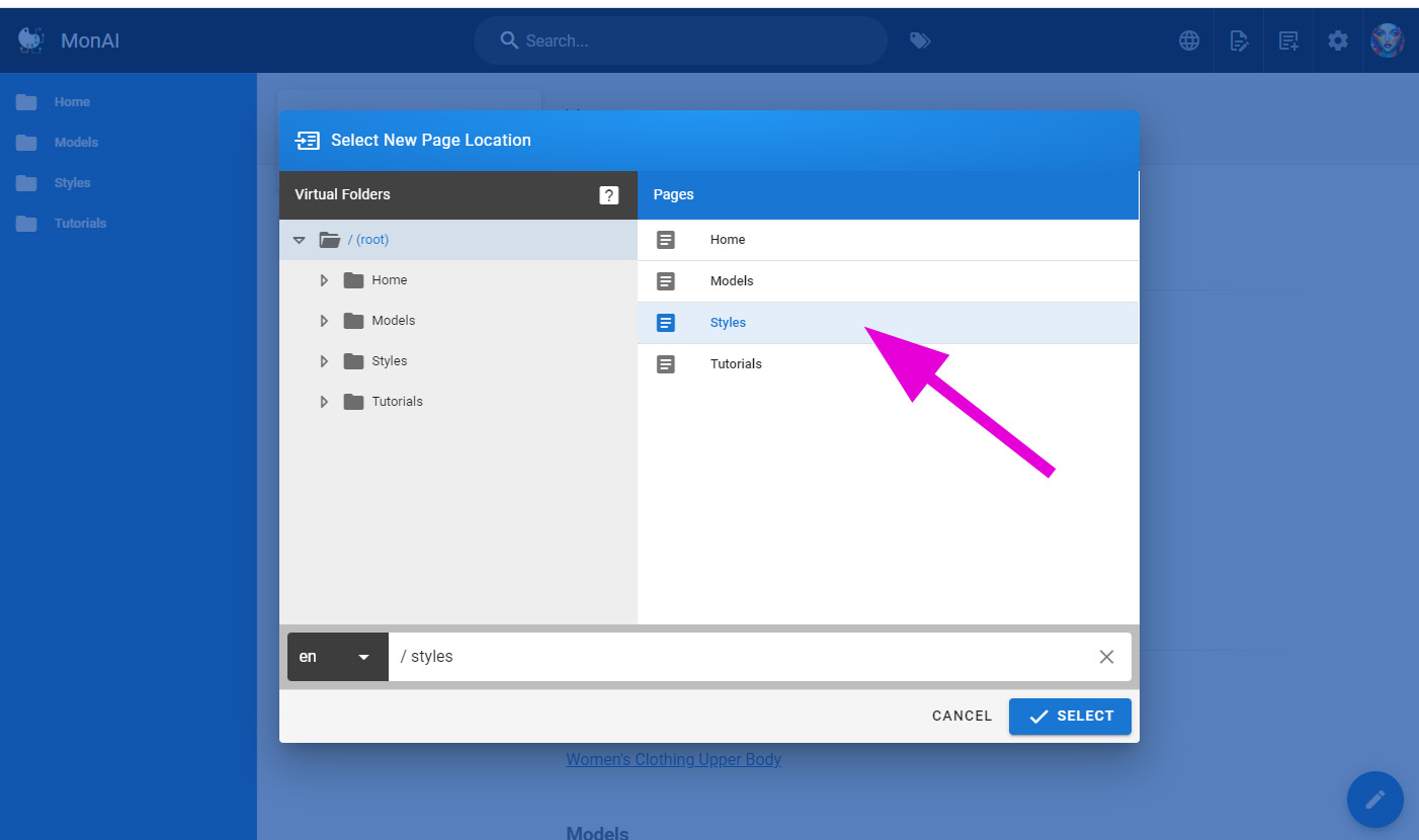 Styles is for prompts and keywords.Models is for AI models available in MonAI.