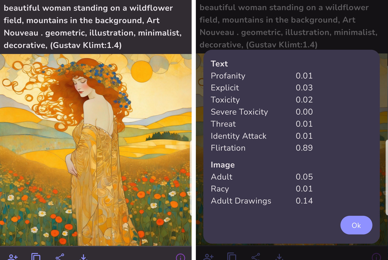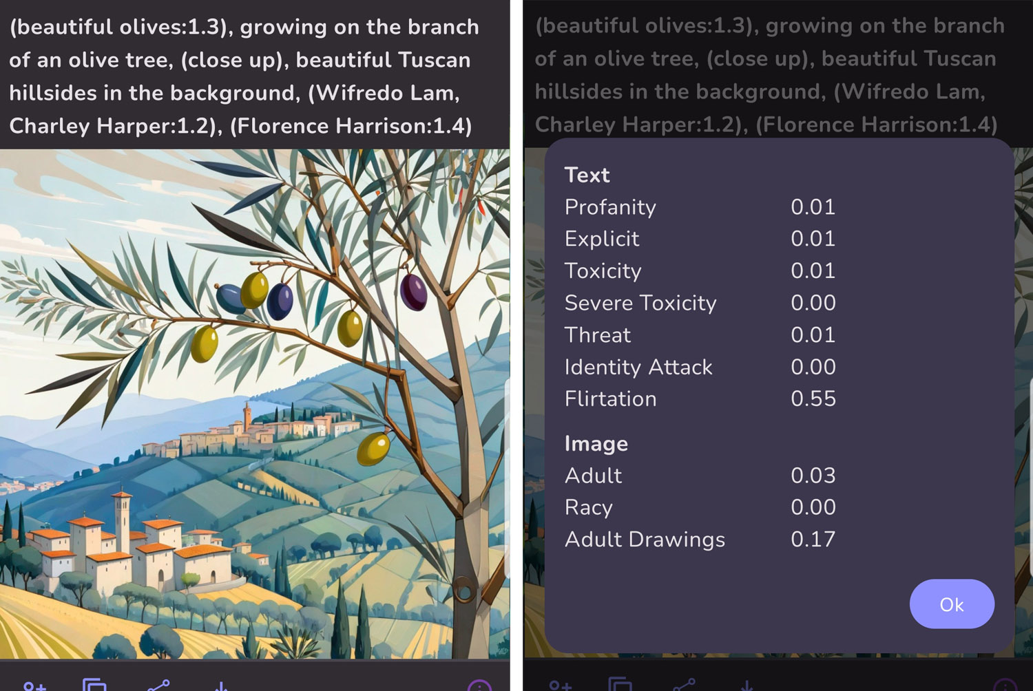 The text filters analyze the prompt text. The image filters analyze the artwork itself.