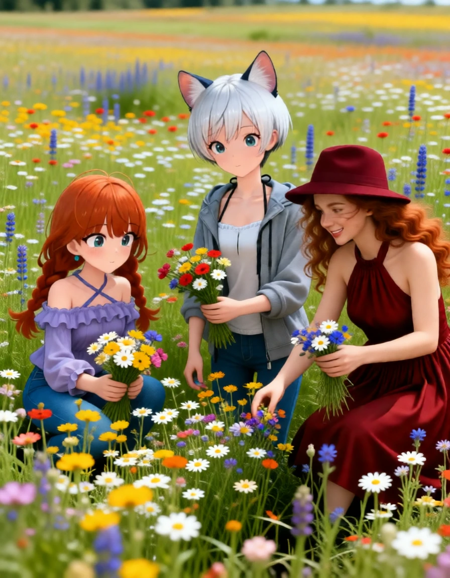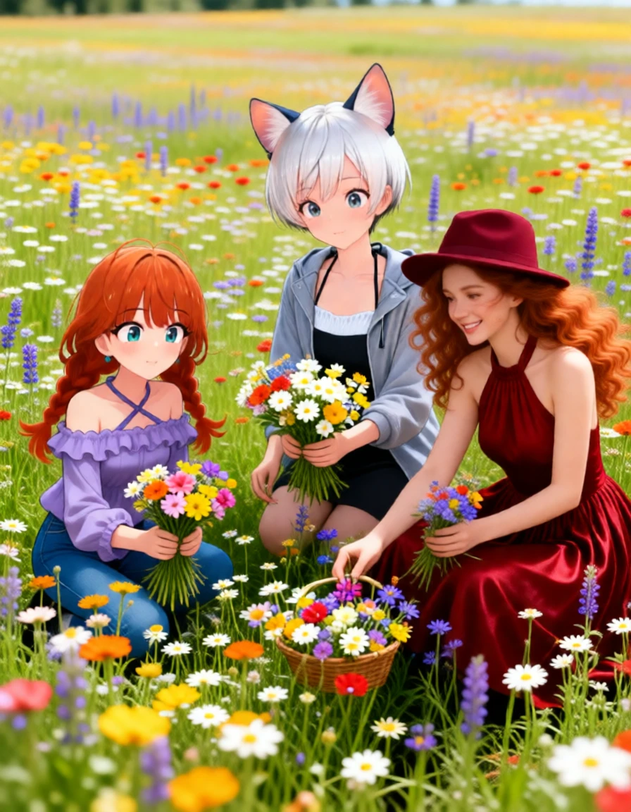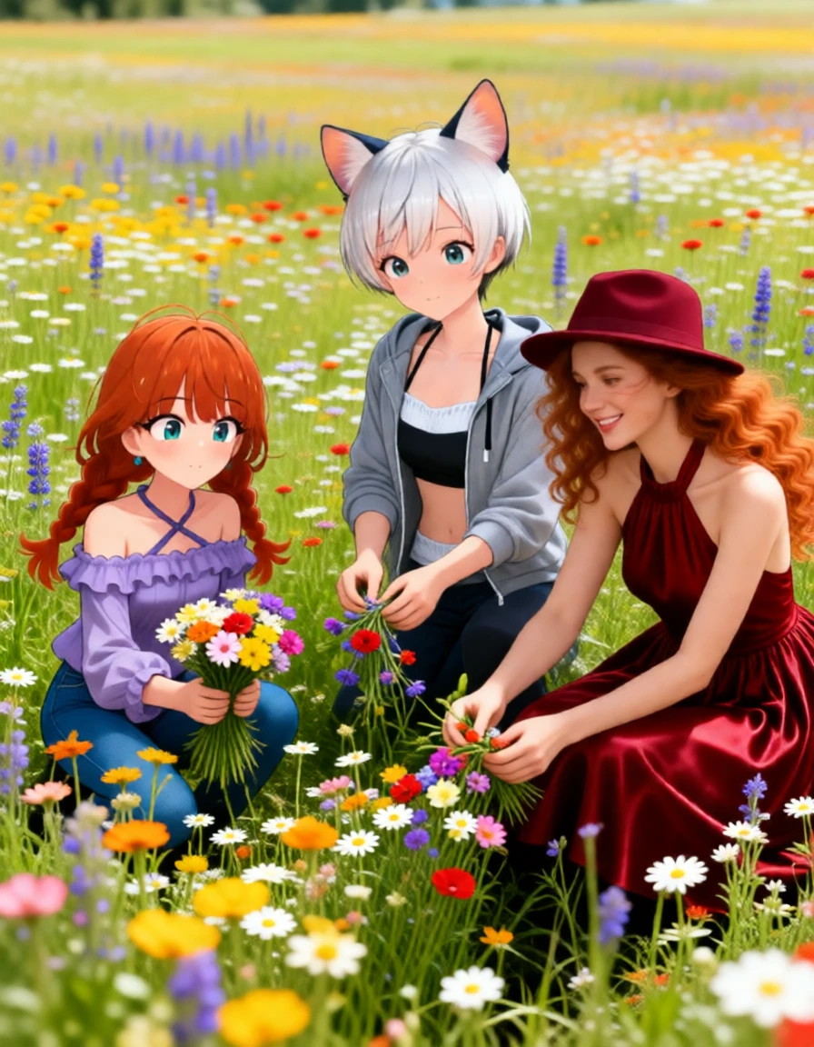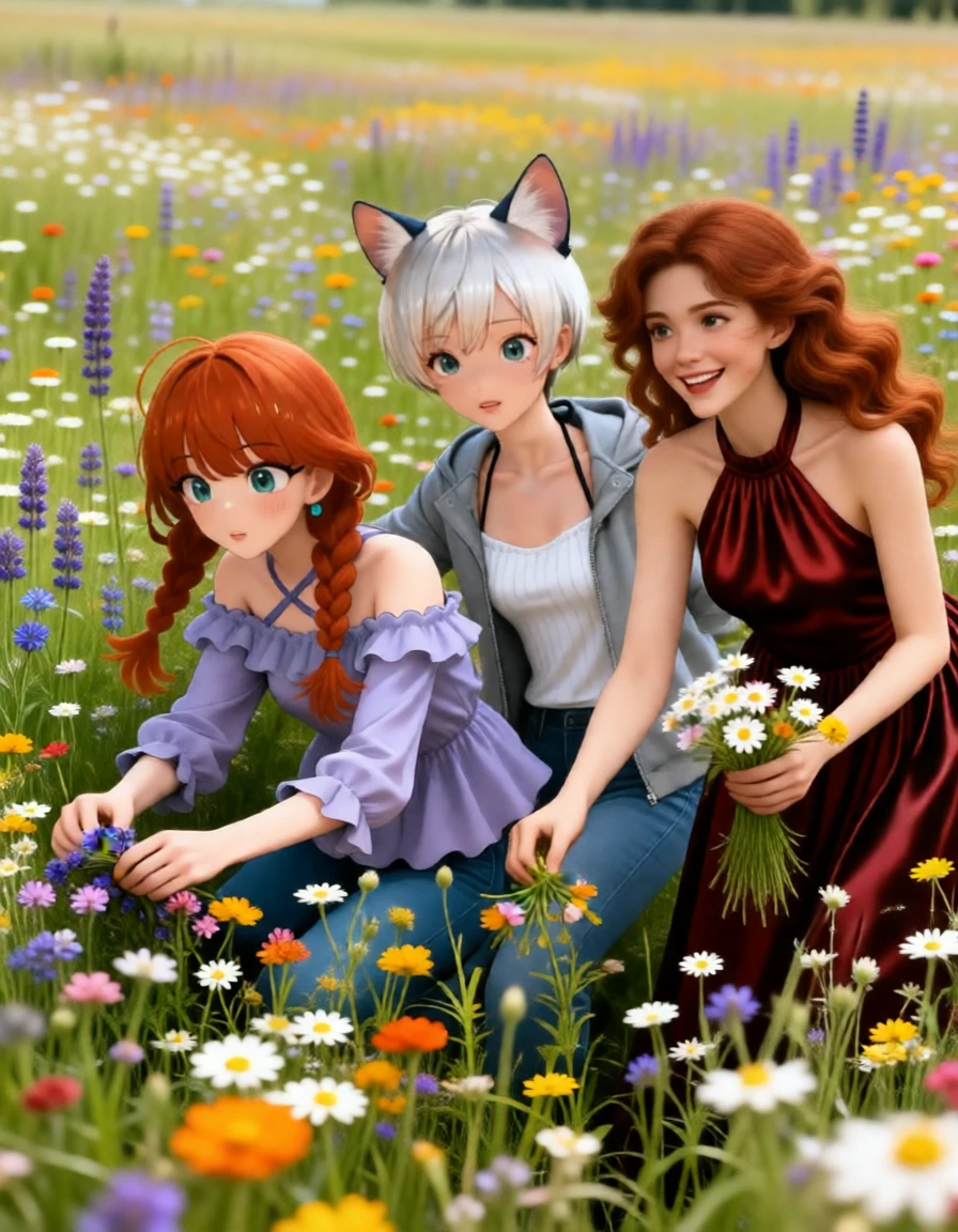 | Prompt: put all 3 characters together in the same scene. they should be gathering flowers from a wildflower field. | ||